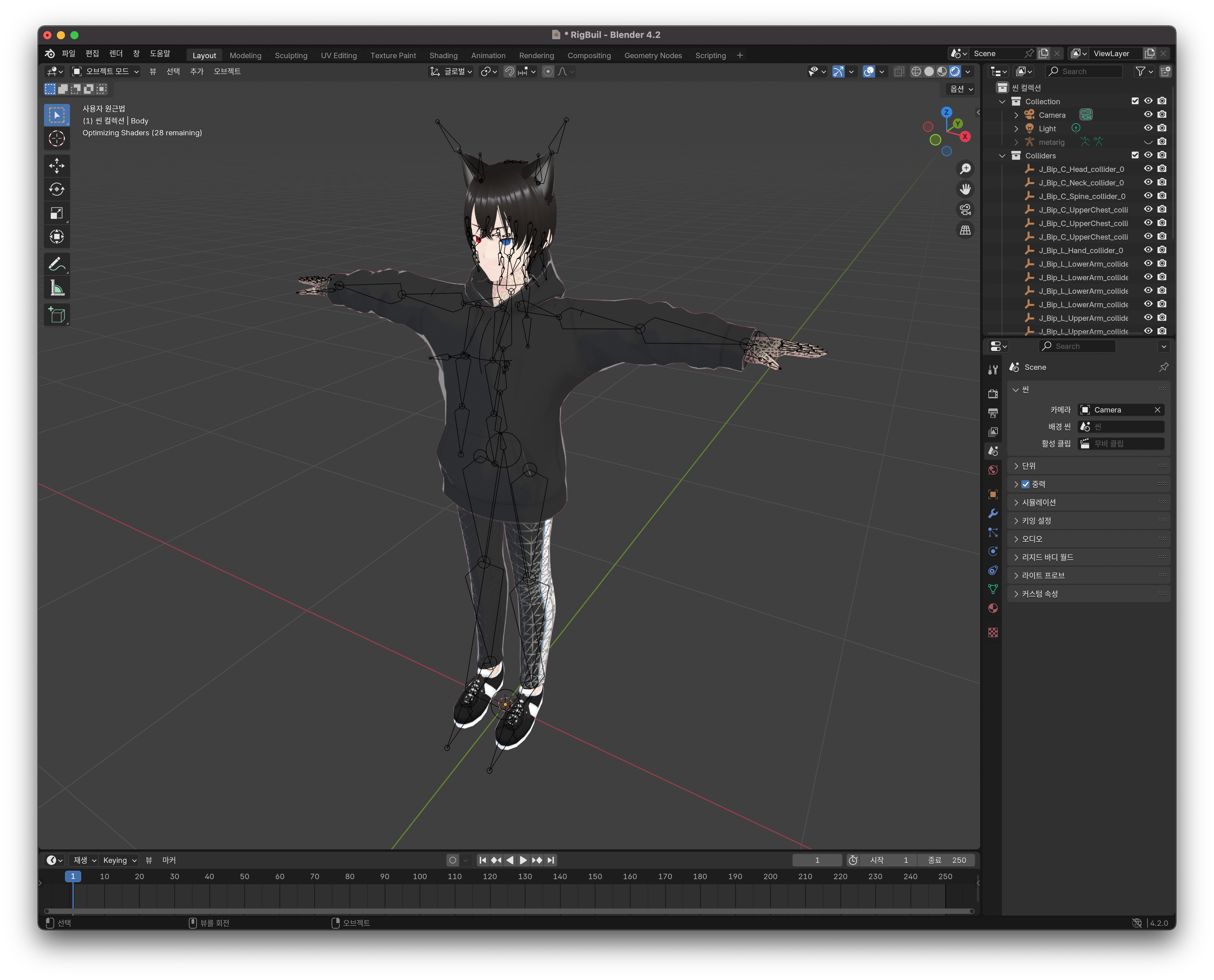 스팀 프로그램 'VRoidStudio'로 만든 내 버추얼 아바타를 블렌더에 업로드한 뒤 리깅을 했다. 1시간쯤 유튜브 영상을 보며 쩔쩔매며 따라하다가 어쨌든 어떻게 된 것 같다(?).