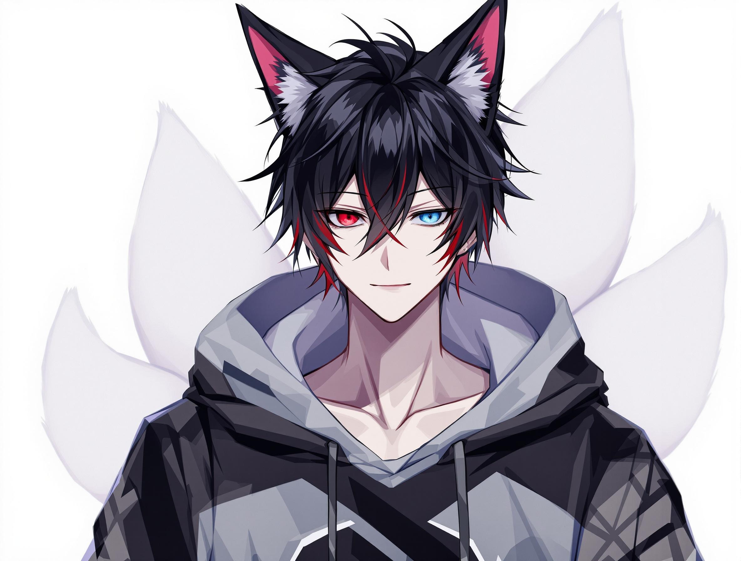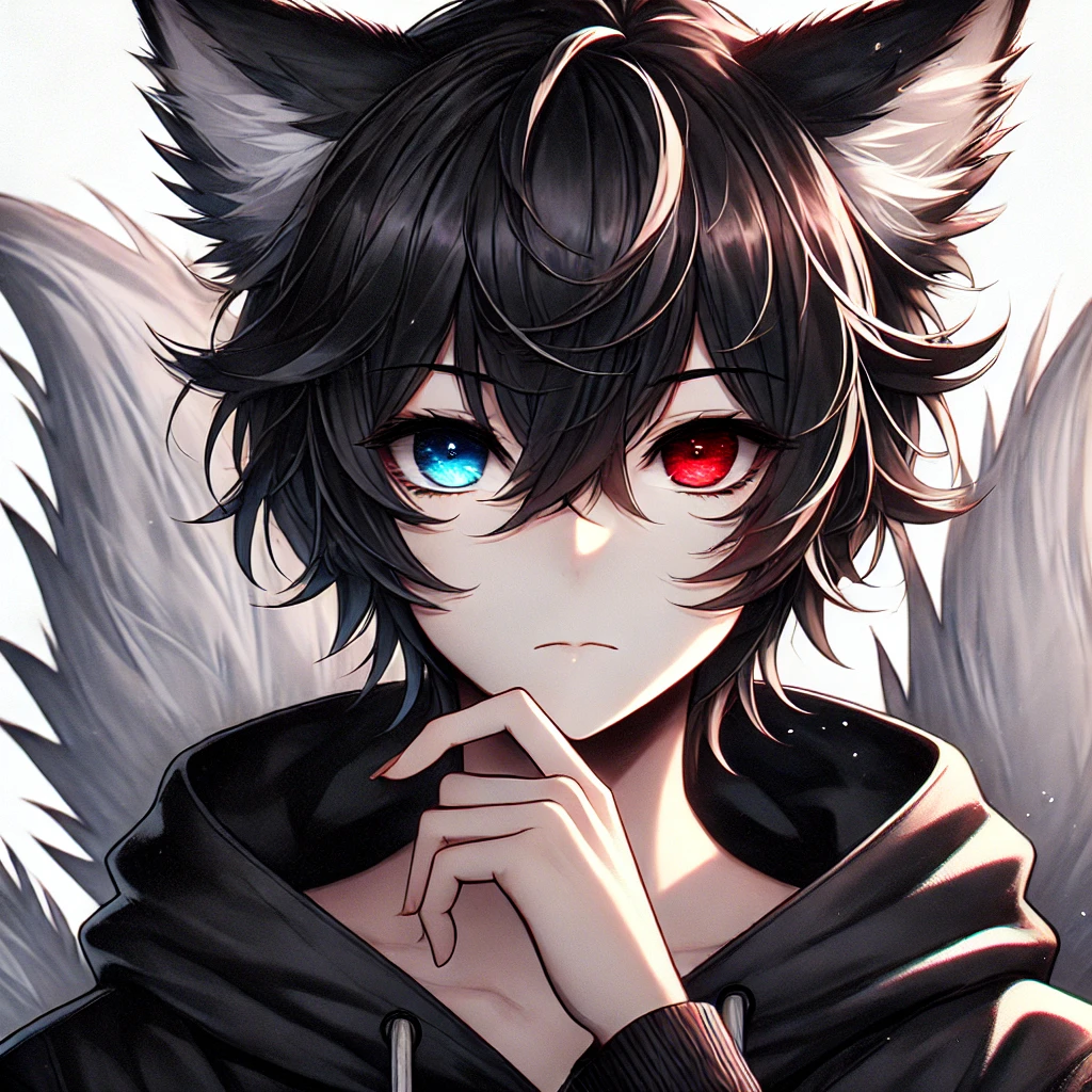 프롬프트: Anime-style illustration of a young male character with black, slightly messy hair and heterochromatic eyes (one red, one blue). He has wolf-like ears covered in black fur with white tips. He wears a black hoodie, slightly oversized, with a mysterious and thoughtful expression, lightly touching his lips with his fingers. Behind him, a fluffy white fox tail is visible, adding a mystical touch. The background is plain white, giving focus to the character's detailed face and clothing. The lighting is soft and slightly dramatic, emphasizing the depth of the hair and clothing folds.