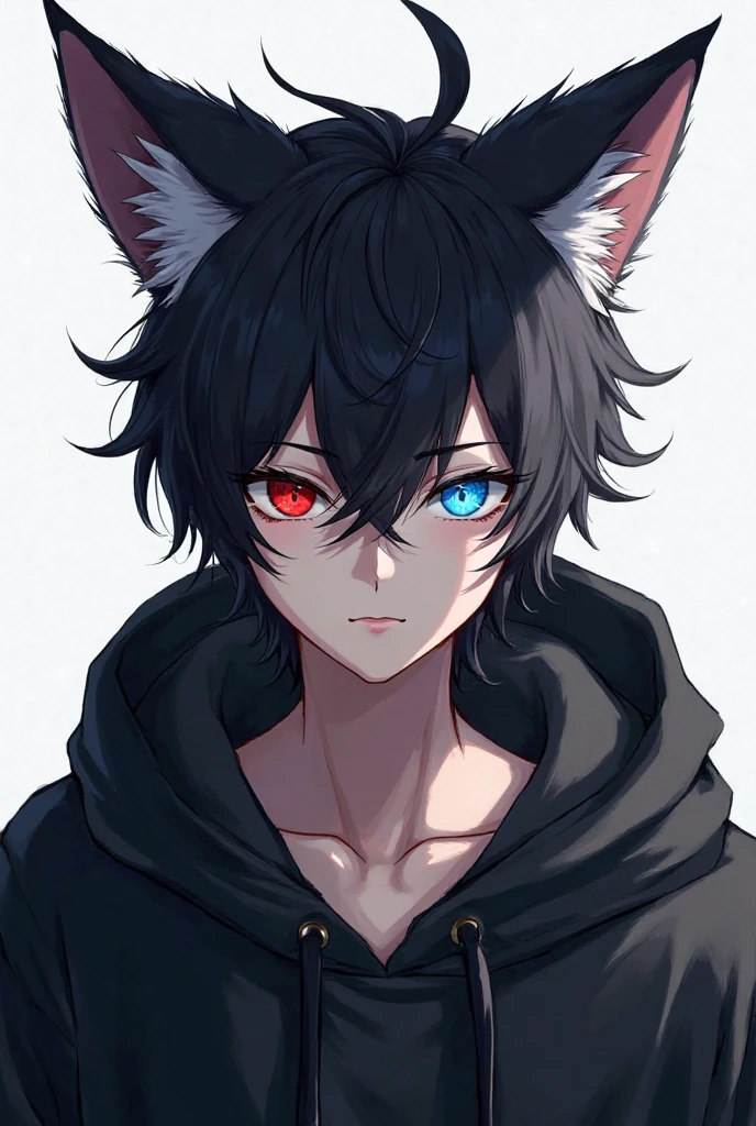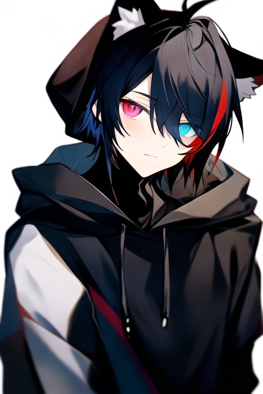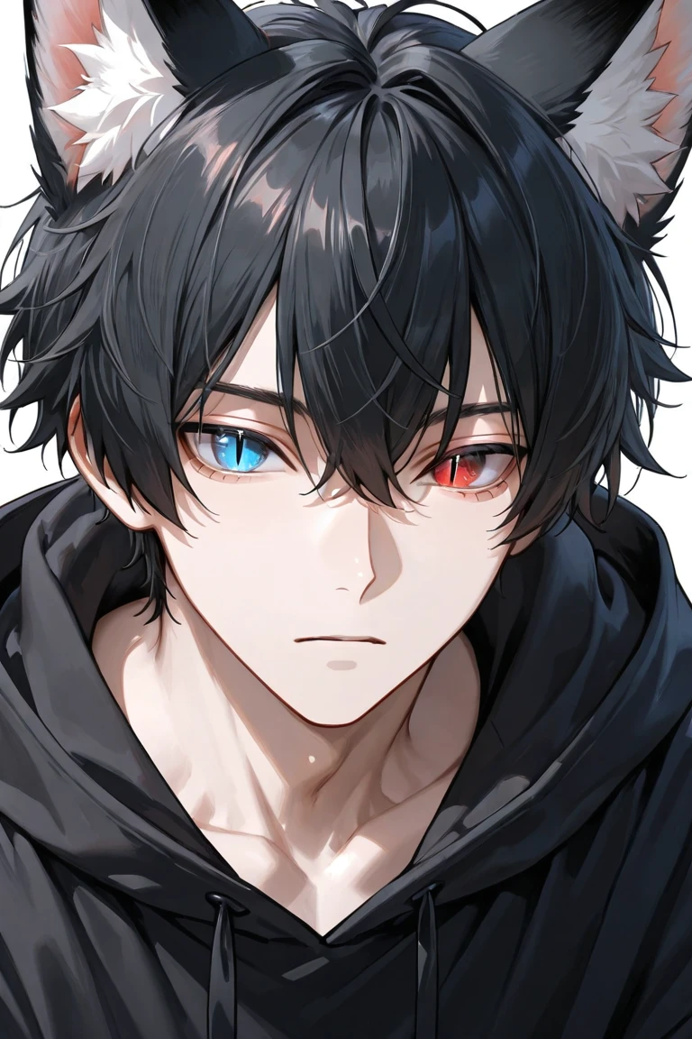 프롬프트: 1 boy, male focus, animal ears, heterochromia, red eyes, blue eyes, black hair, black hoodie, white background, animal ear fluff, fox ears, hood down, slit pupils