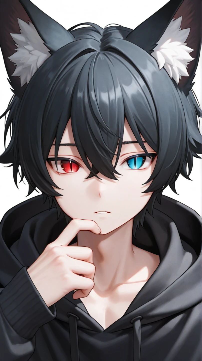 Anime-style illustration of a young male character with black, slightly messy hair and heterochromatic eyes (one red, one blue). He has wolf-like ears covered in black fur with white tips. He wears a black hoodie, slightly oversized, with a mysterious and thoughtful expression, lightly touching his lips with his fingers. Behind him, a fluffy white fox tail is visible, adding a mystical touch. The background is plain white, giving focus to the character's detailed face and clothing. The lighting is soft and slightly dramatic, emphasizing the depth of the hair and clothing folds.